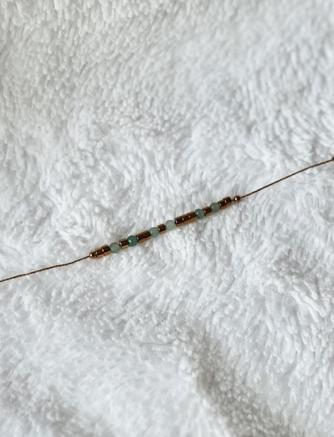 Découvre ce bracelet en acier inoxydable, composé de petites perles couleur émeraude et or et une chaîne fine en or.