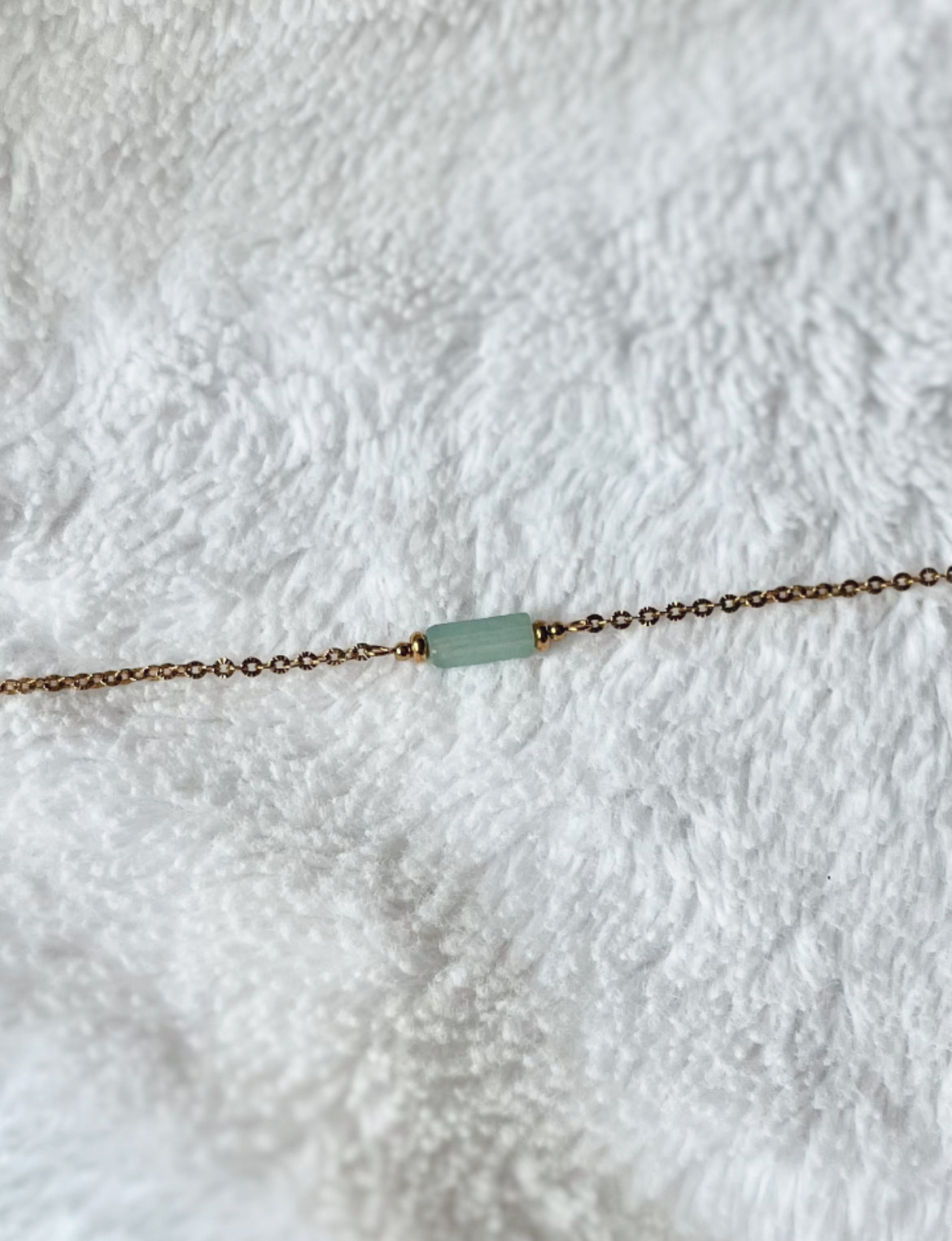 Découvre ce bracelet en acier inoxydable, composé d’un détail rectangulaire couleur émeraude et d’une chaîne en or.