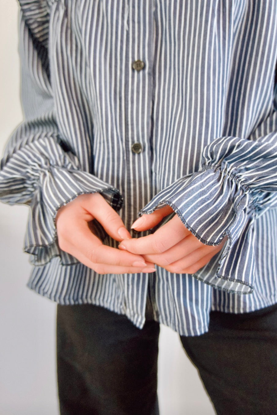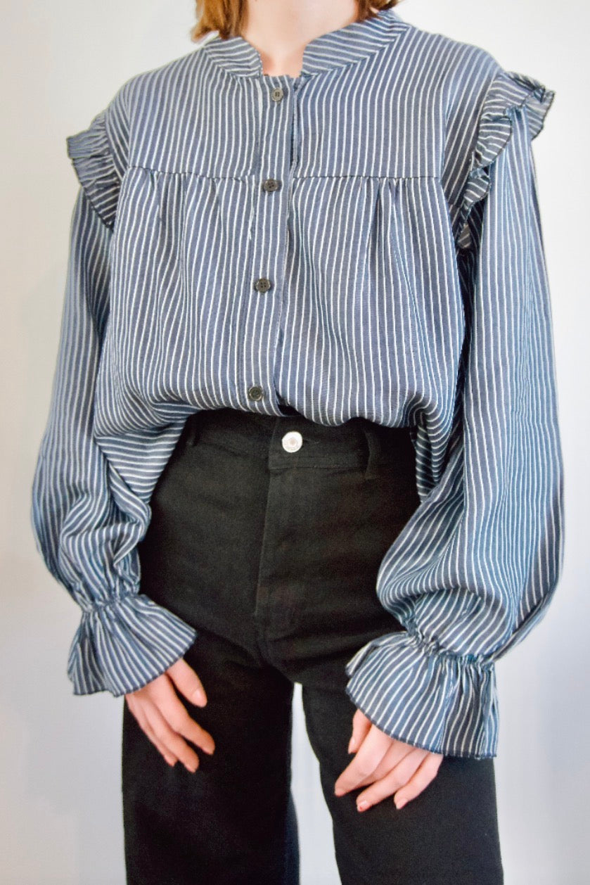 Chemisier Fanny bleu à rayure avec manches bouffantes et détails aux épaules.