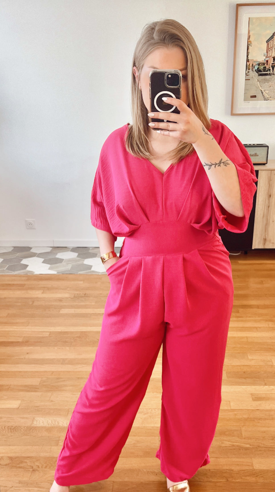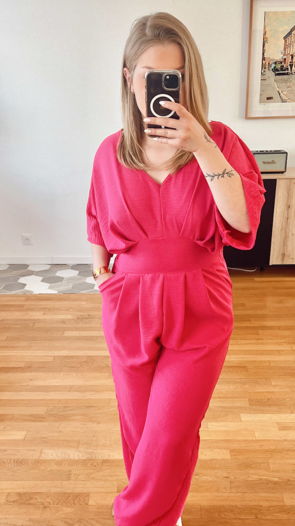 Combinaison col V fuchsia avec poches et nœud à l'arrière.