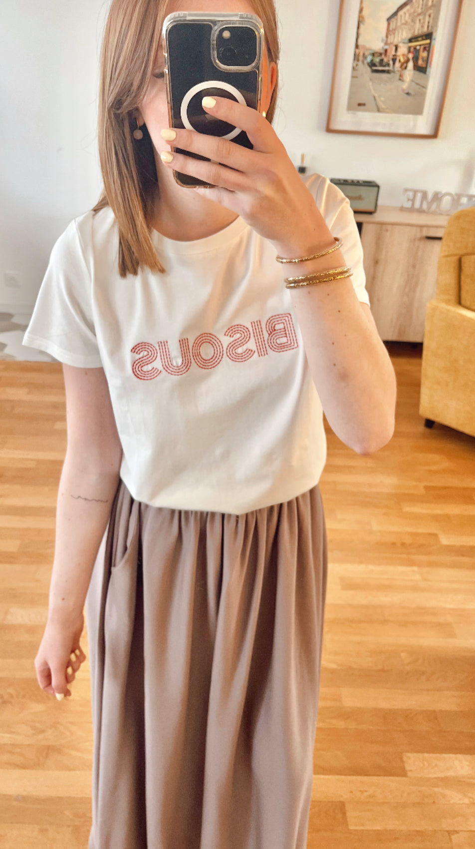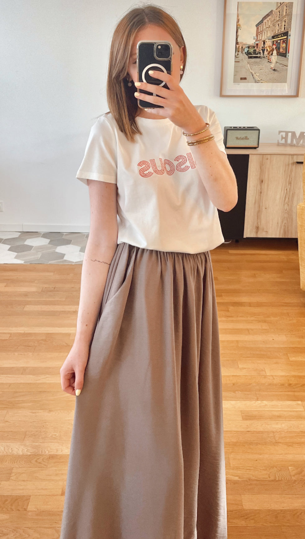 Jupe longue fluide taupe avec poches en viscose souple (viscose de lin).